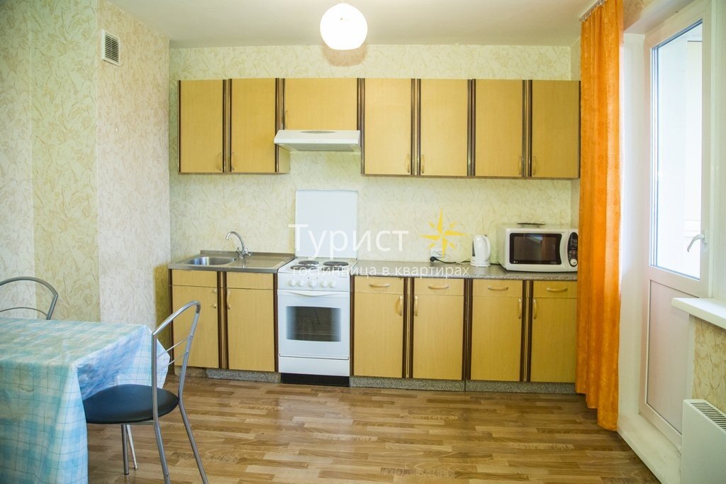 Кухня обставлена требуемым гарнитуром, укомплектована столовыми приборами и принадлежностями, а также бытовой электротехникой, в частности микроволновкой.